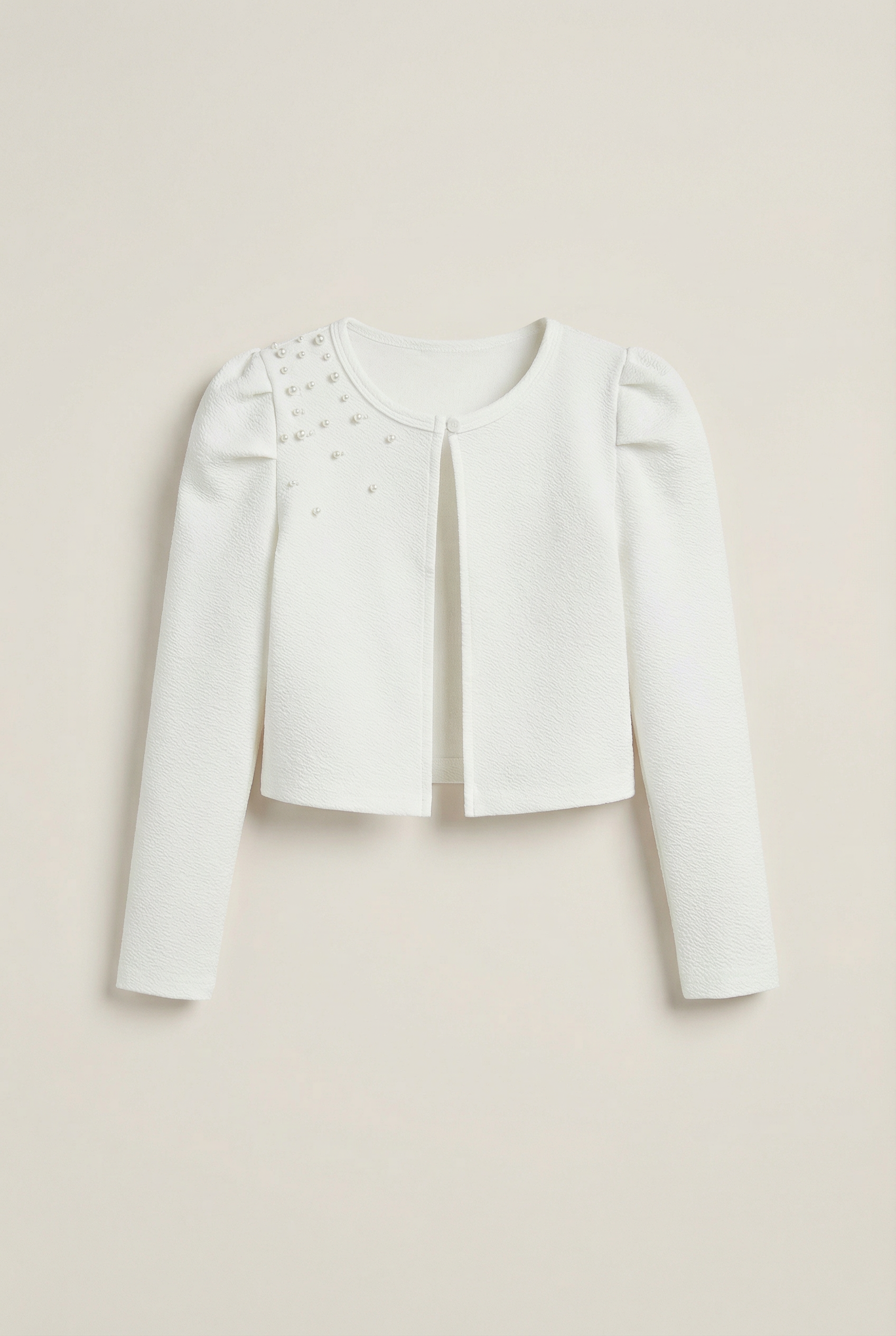 Izgatavots no augstas kvalitātes auduma ekrū krāsā, šis bolerko ir piemērots vēsākām dienām pavasarī un vasarā, nodrošinot komfortu un aizsardzību pret aukstumu, nezaudējot eleganci. Tas ir ideāls izvēle jaunajai dāmai dažādos īpašos notikumos, sākot no svētkiem, ģimenes svinībām līdz pat oficiāliem skolas pasākumiem.