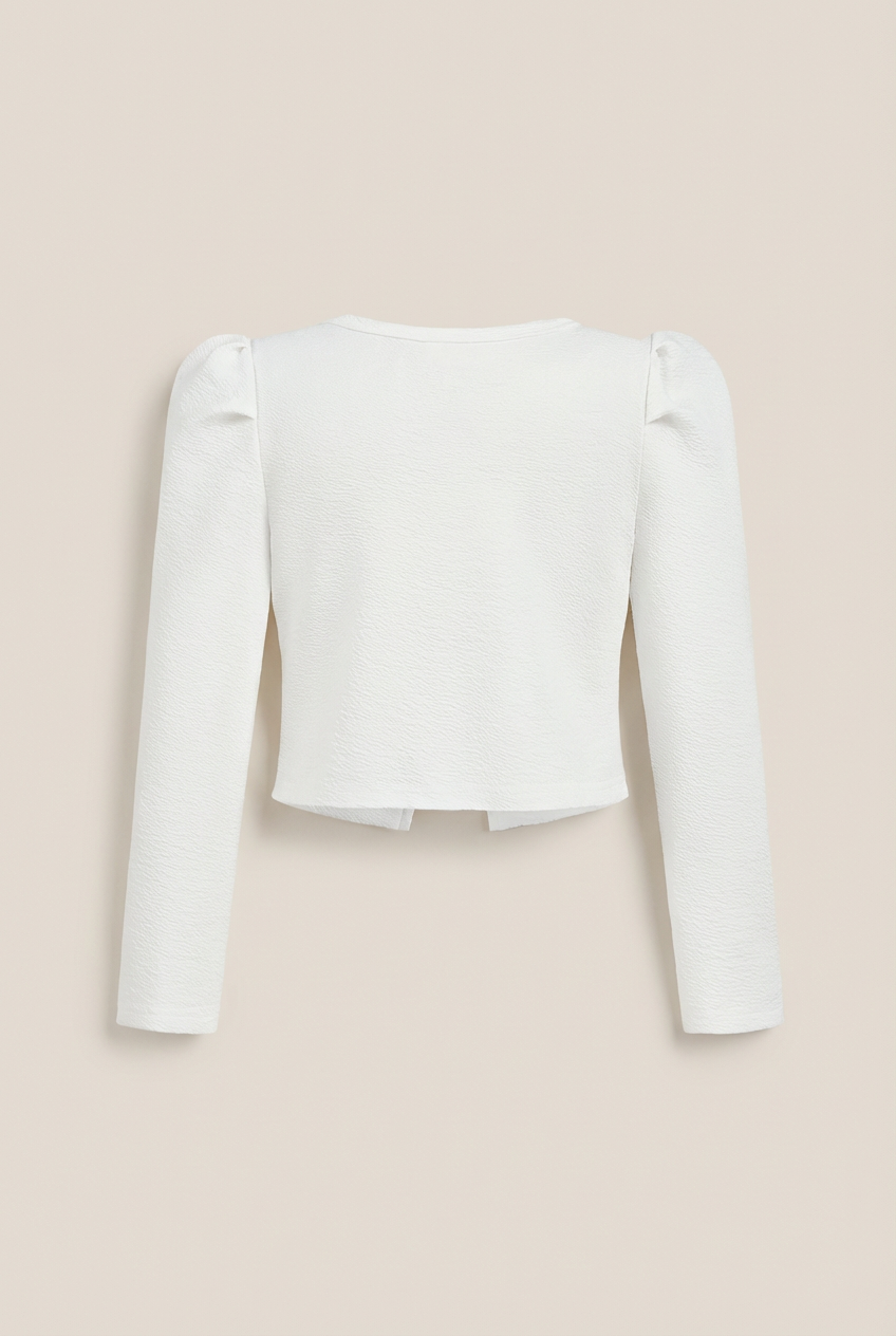 Bērnu bolerko "Giorgia" ir smalkuma un meitenīgās žēlastības iemiesojums, kas ir ideāls papildinājums jebkurai svētku tērpam. Tā neaizvērtais stils uzsver vieglumu un brīvību, vienlaikus ļaujot to viegli uzvilkt pār kleitu, neietekmējot tērpa kopējo kompozīciju. Bolerko "Giorgia" ir izrotāts ar īpašu uzmanību detaļām - smalkas pērlītes pie dekoltes piešķir tam unikālu raksturu un eleganci.