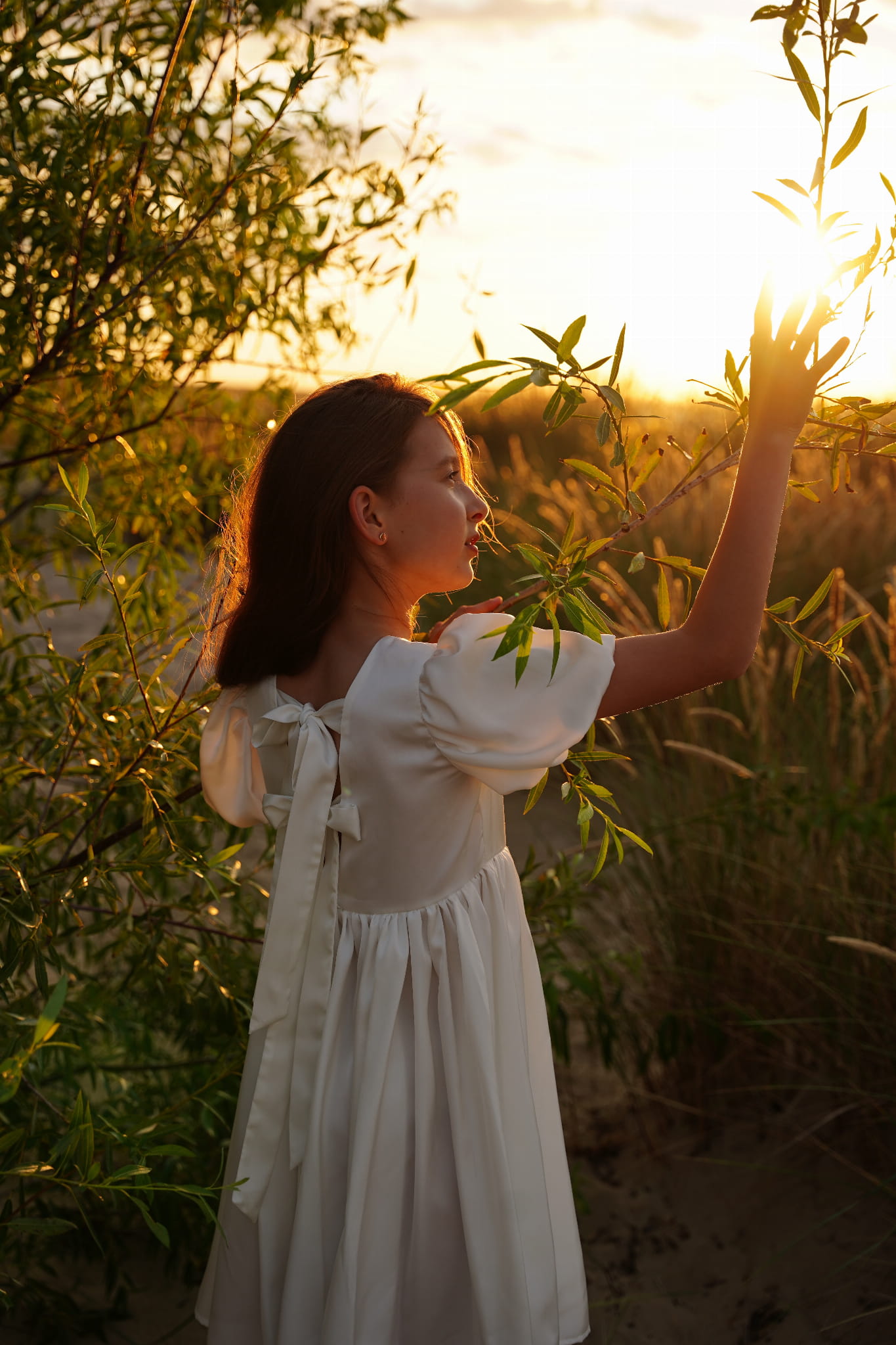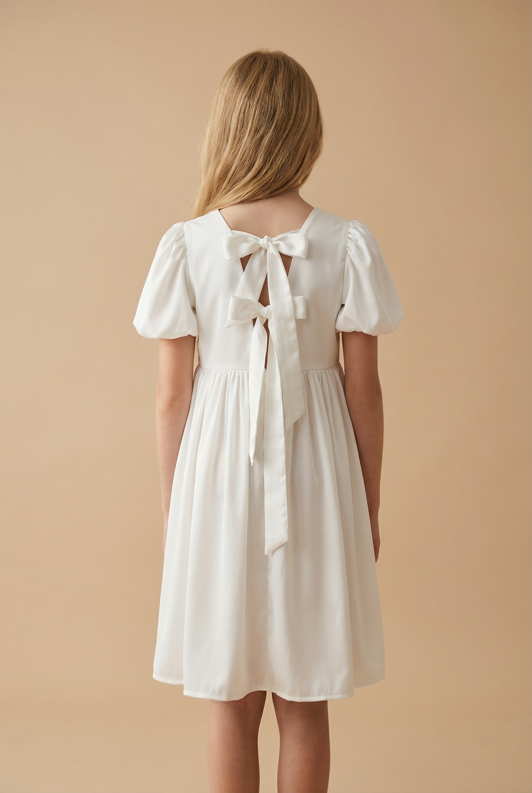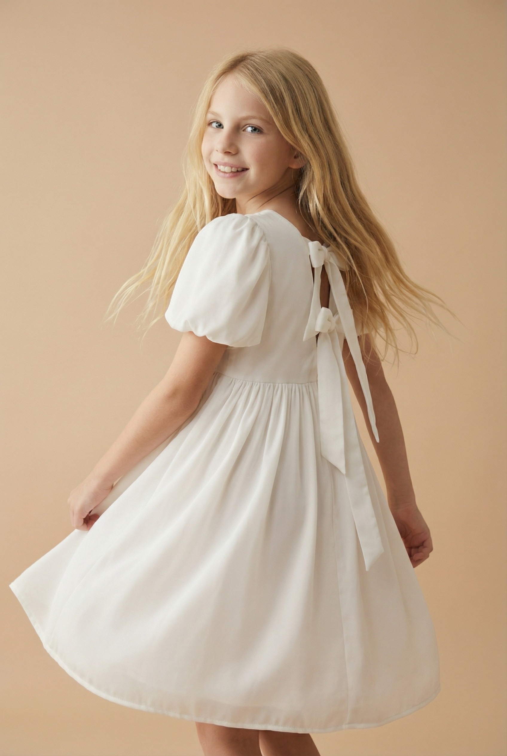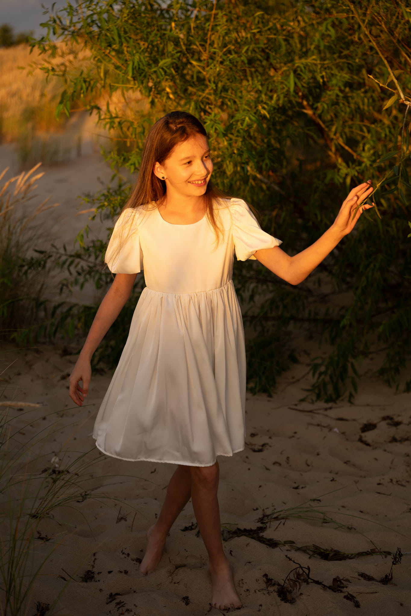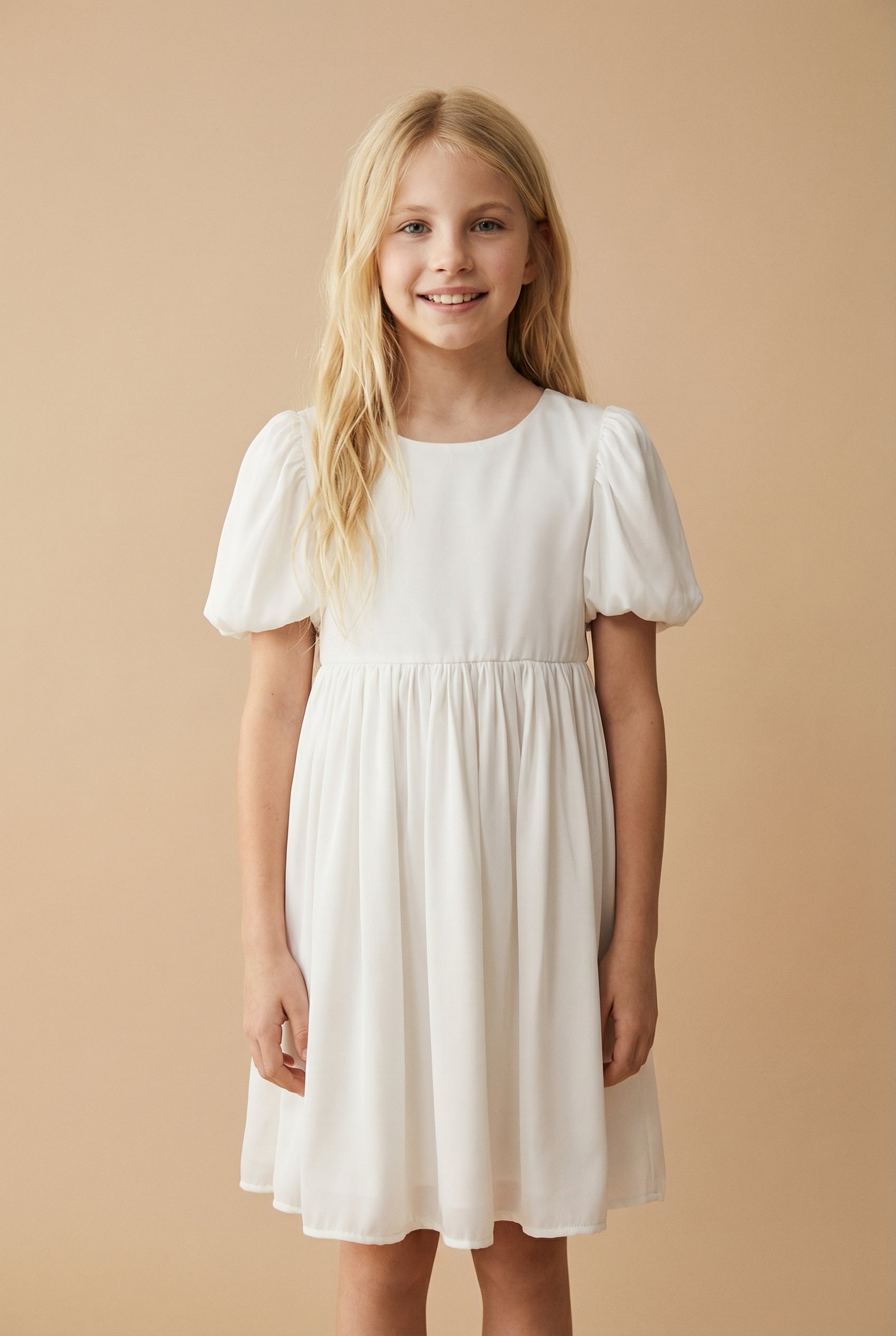 Šī kleita nav pārsātināta ar liekām detaļām; tās skaistums slēpjas izsmalcinātā minimālismā. Krēmbaltais tonis atgādina putukrējuma mākoņus vasaras debesīs, piešķirot tēlam vieglumu un gaisīgumu. Tā ir izvēle vecākiem, kuri novērtē klasisku stilu un vēlas, lai viņu bērns izskatītos eleganti, bet vienlaikus justos brīvi un nepiespiesti.