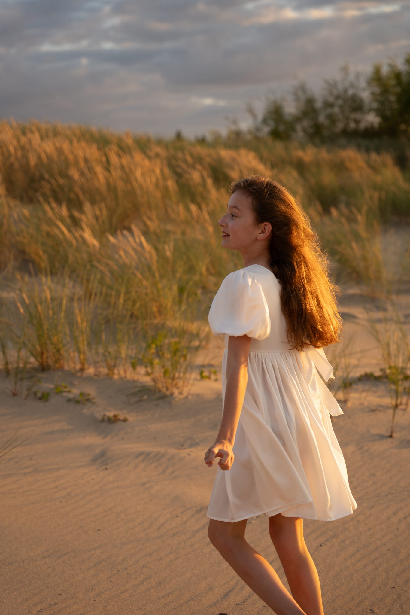 Bērnība ir kustība, deja un rotaļa. Sia kleita ir veidota, domājot par mazās dāmas komfortu. Tās brīvais, trapecveida piegriezums ļauj skriet, griezties un baudīt svētkus bez ierobežojumiem. Īpašu šarmu piešķir bufetes tipa piedurknes, kas tēlam piešķir romantisku un nedaudz sapņainu noskaņu, gluži kā no senām pasaku grāmatām.