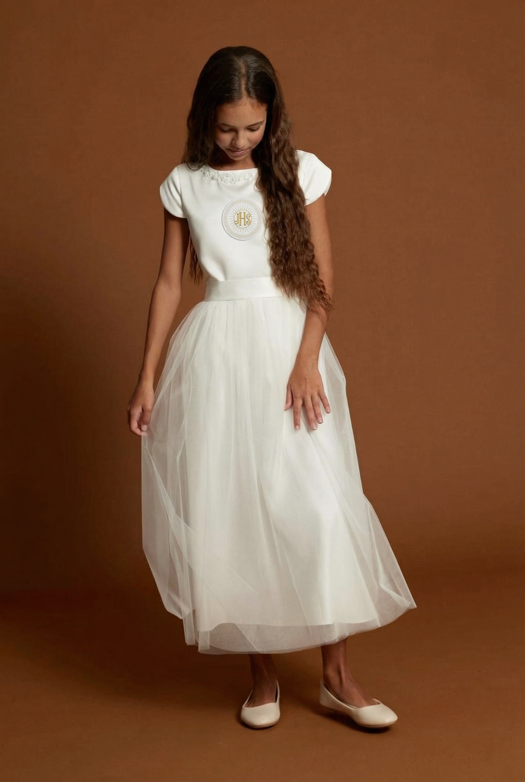 - Simboliska nozīme: IHS monogramma ir sens kristietības simbols, kas piešķir tērpam dziļāku jēgu un svinīgumu, atgādinot par dienas garīgo būtību.
